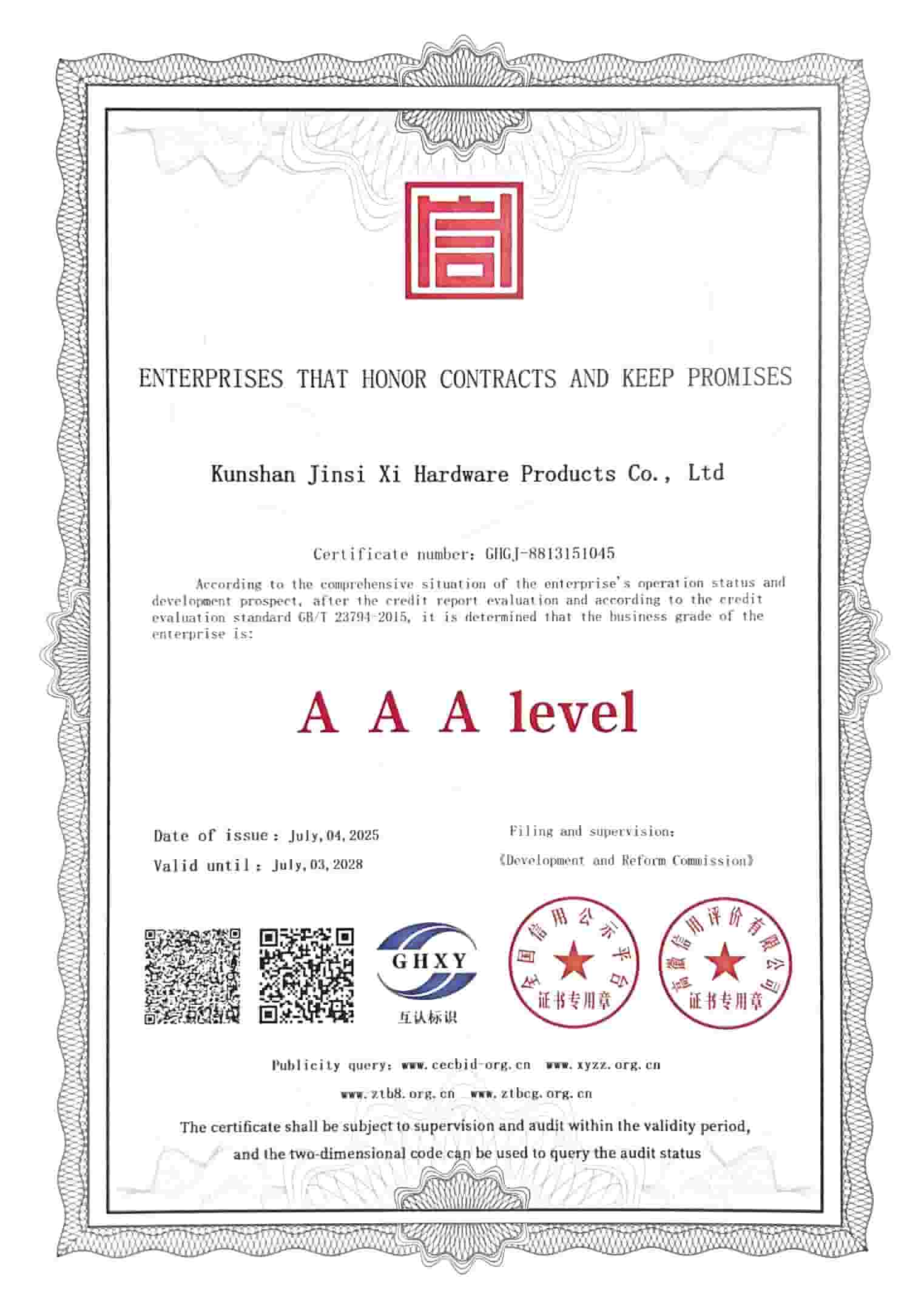 KunShanJinsixiMetalware Co, Ltd wis resmi dianugerahi Judhul "AAA Tingkat Enterprises sing kontrak ngurmati lan tetep janji". Jinsixi wis mesthi adil kanggo filsafat bisnis "kesatuan, rajin, ngupayakake keunggulan, nyedhiyakake pelanggan kanthi kualitas tinggi, lan pungkasane entuk" kasenengan sing sampurna ".